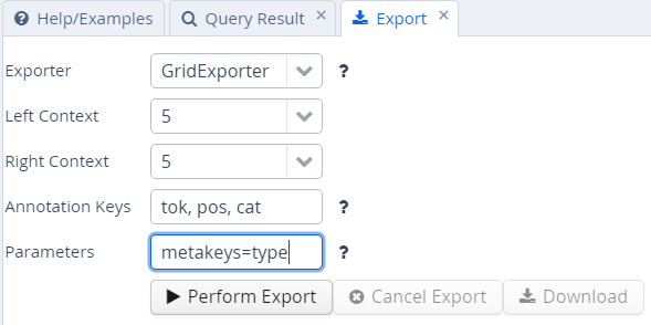 It is also possible to output metadata annotations per hit using the CSVExporter. To do so, use the parameter metakeys=meta1,meta2 etc. For example, if your documents have a metadata annotation called 'genre', you may export it for each search result as a further column using metakeys=genre in the parameters box.